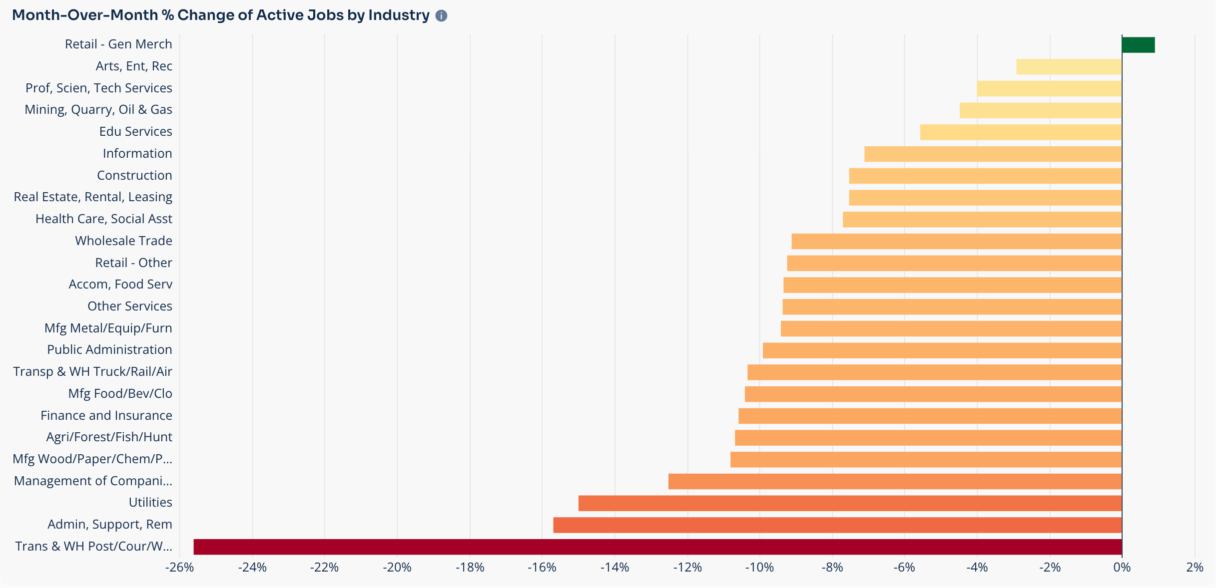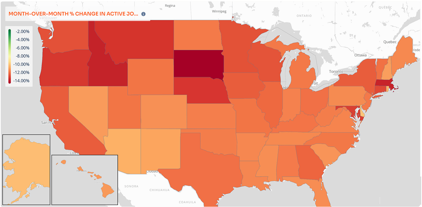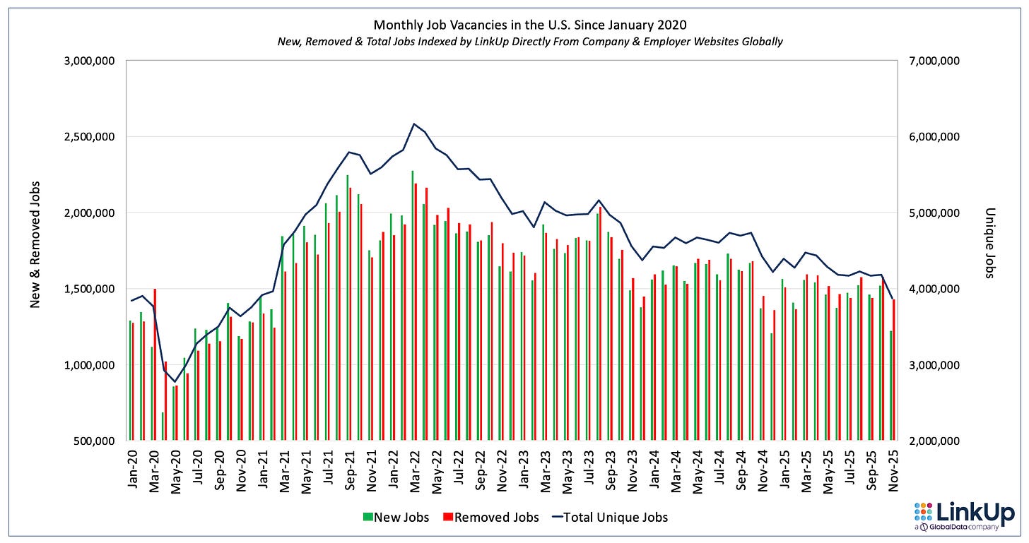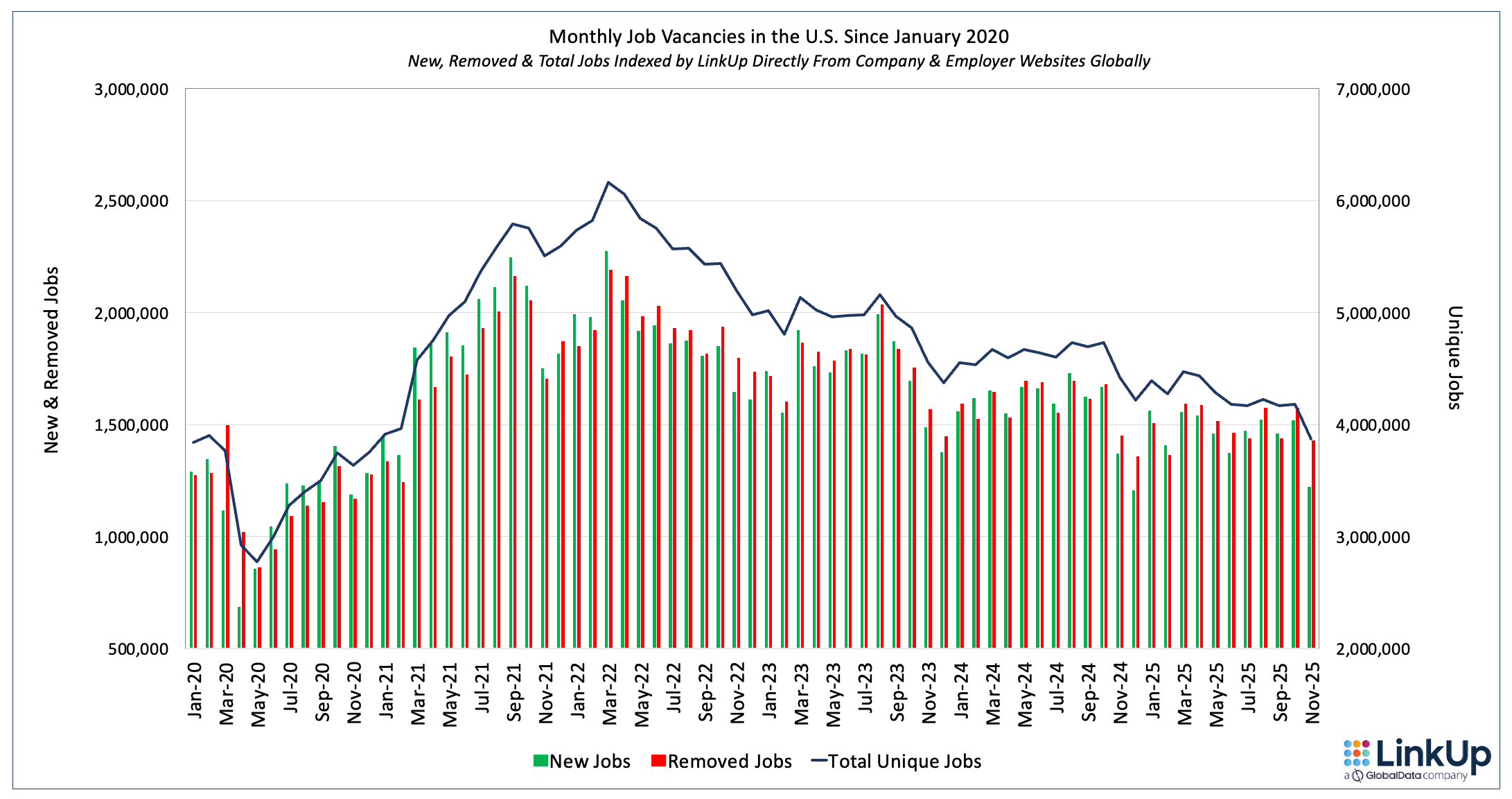 In November, U.S. job openings indexed daily directly from company and employer websites globally declined by 8%, while new job openings plummeted 20% and removed job openings fell 9%.