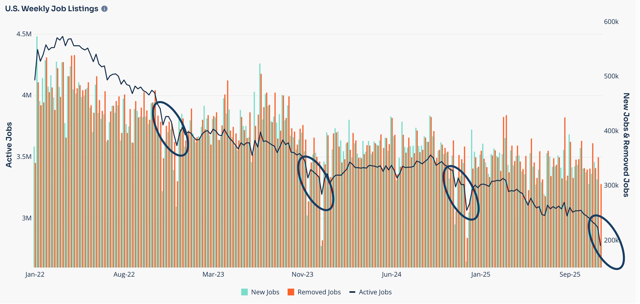 Not surprisingly given that Thanksgiving was last week, U.S. job openings posted globally by companies and employers on their websites around the world dropped last week by 145,877 or 5.0% from the week before last. Over the past 3 previous Thanksgiving weeks since 2022, the average decline was 3.7%, so this year’s drop, while expected, is nonetheless quite a bit larger than history would suggest.